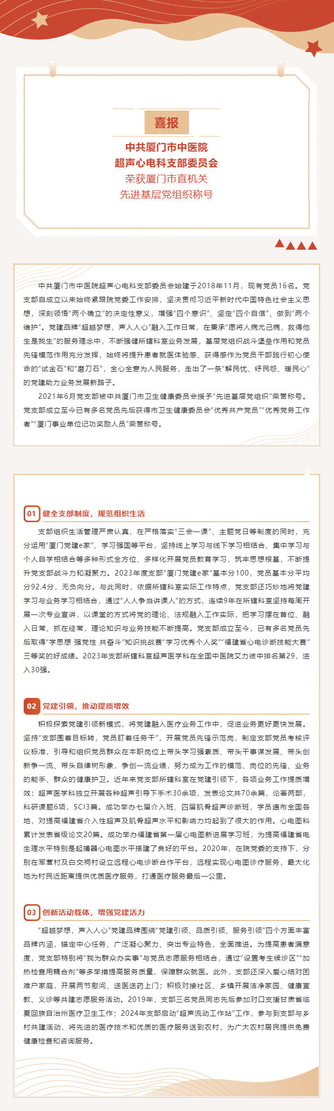 中共金瓶梅 超声心电科支部委员会荣获厦门市直机关先进基层党组织称号