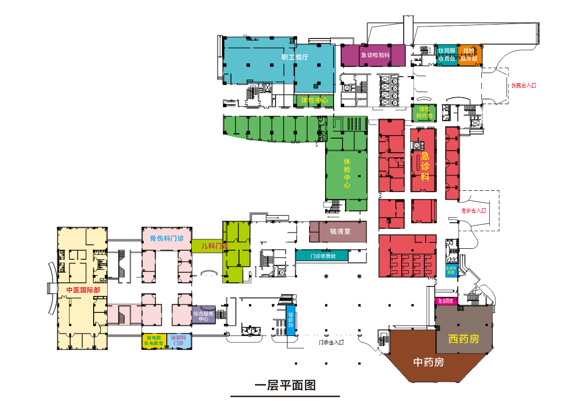 1F  咨询台、综合服务中心、住院服务部、门诊收费处、儿科门诊、骨伤科门诊、泌尿外科门诊、脑电图室/肌电图室、中医国际部、 西药房、中药房、全成分颗粒药房、体检中心、急诊部、急诊检验科、职工餐厅