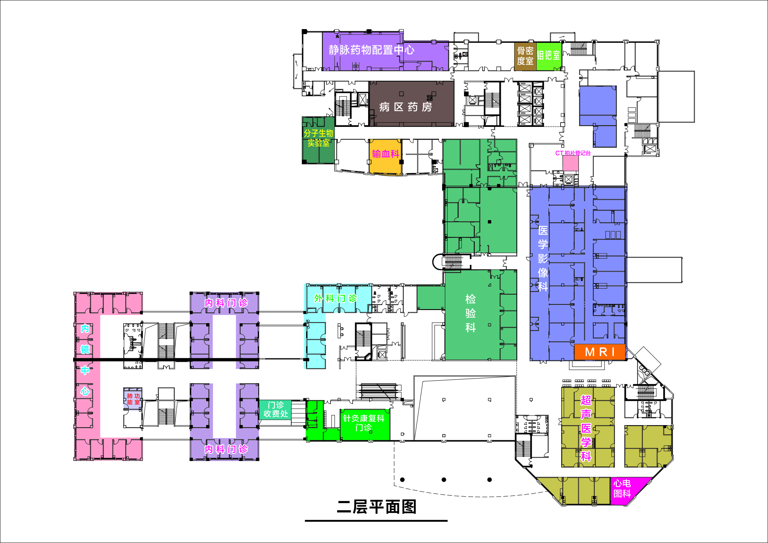 2F:病区药房、静脉配置中心、超声医学科、心电科、医学影像科(拍片、CT、磁共振)、钼靶室、骨密度室、