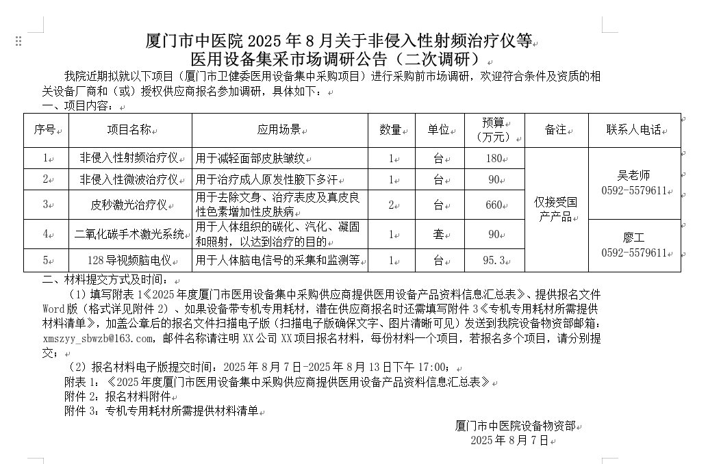 金瓶梅 2025年8月关于非侵入性射频治疗仪等医用设备集采市场调研公告(二次调研)