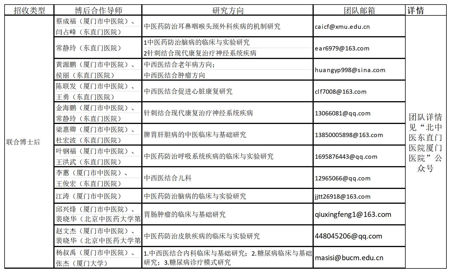 【招收方向及合作导师】(团队招收详情见“北中医东直门医院厦门医院”微信公众号)