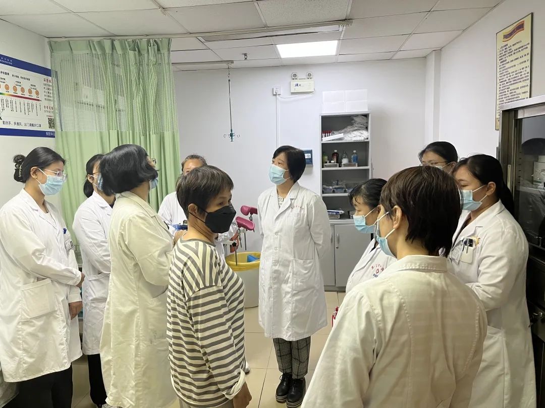 刘海英主任查房后,给一位患者做妇科检查,详细分析病情,与医护人员一起进行讨论。