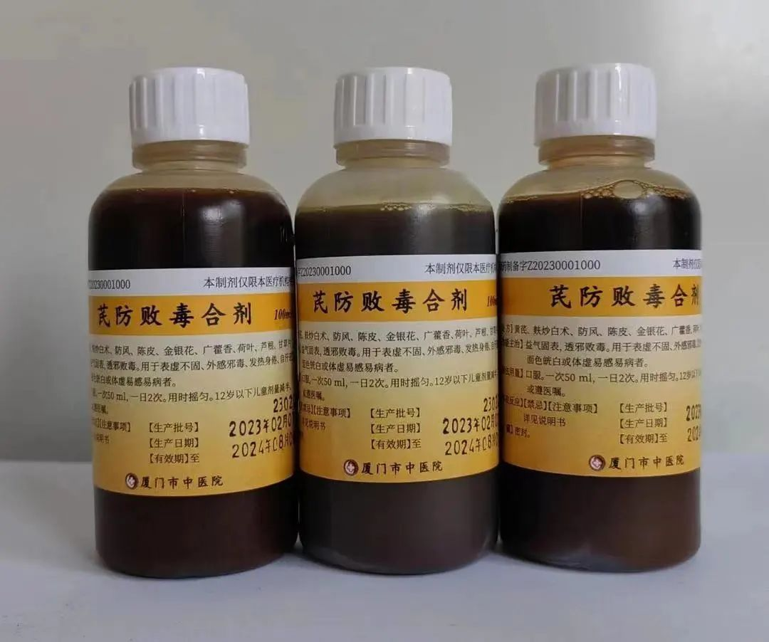 芪防败毒合剂在益气固表的经典名方玉屏风散基础上,结合福建地热多湿的特点,加用理气之陈皮、解毒之金银花,化浊利湿之广藿香、荷叶和芦根等制备而成,功能益气固表,透邪败毒,临床用于表虚不固、外感邪毒、发热身倦、自汗恶风、面色㿠白或体虚易感易病者。