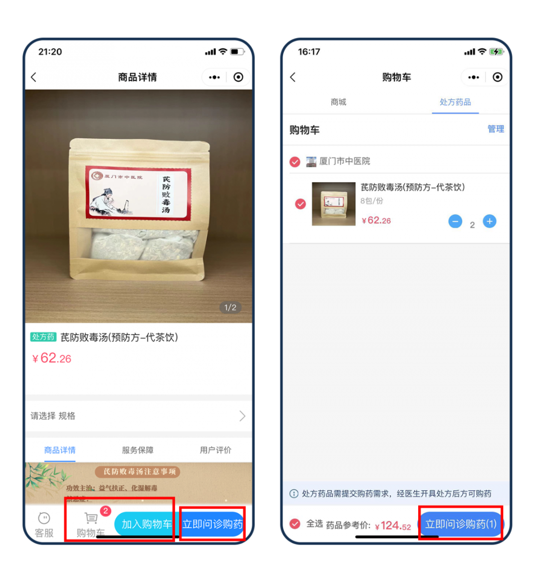 ② 选择药品及份数,如需购买不同药品,可先【加入购物车】,再点击购物车图标,在购物车页面点击【立即问诊购药】;如只购买单种药品,直接点击右下角【立即问诊购药】即可;