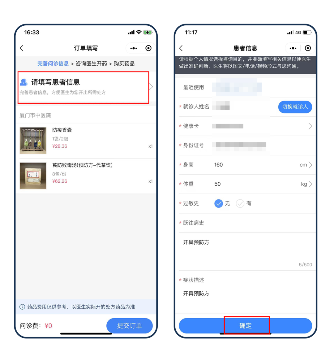 ③ 完善问诊信息,确认药品信息,点击提交下单,等待医生开单。