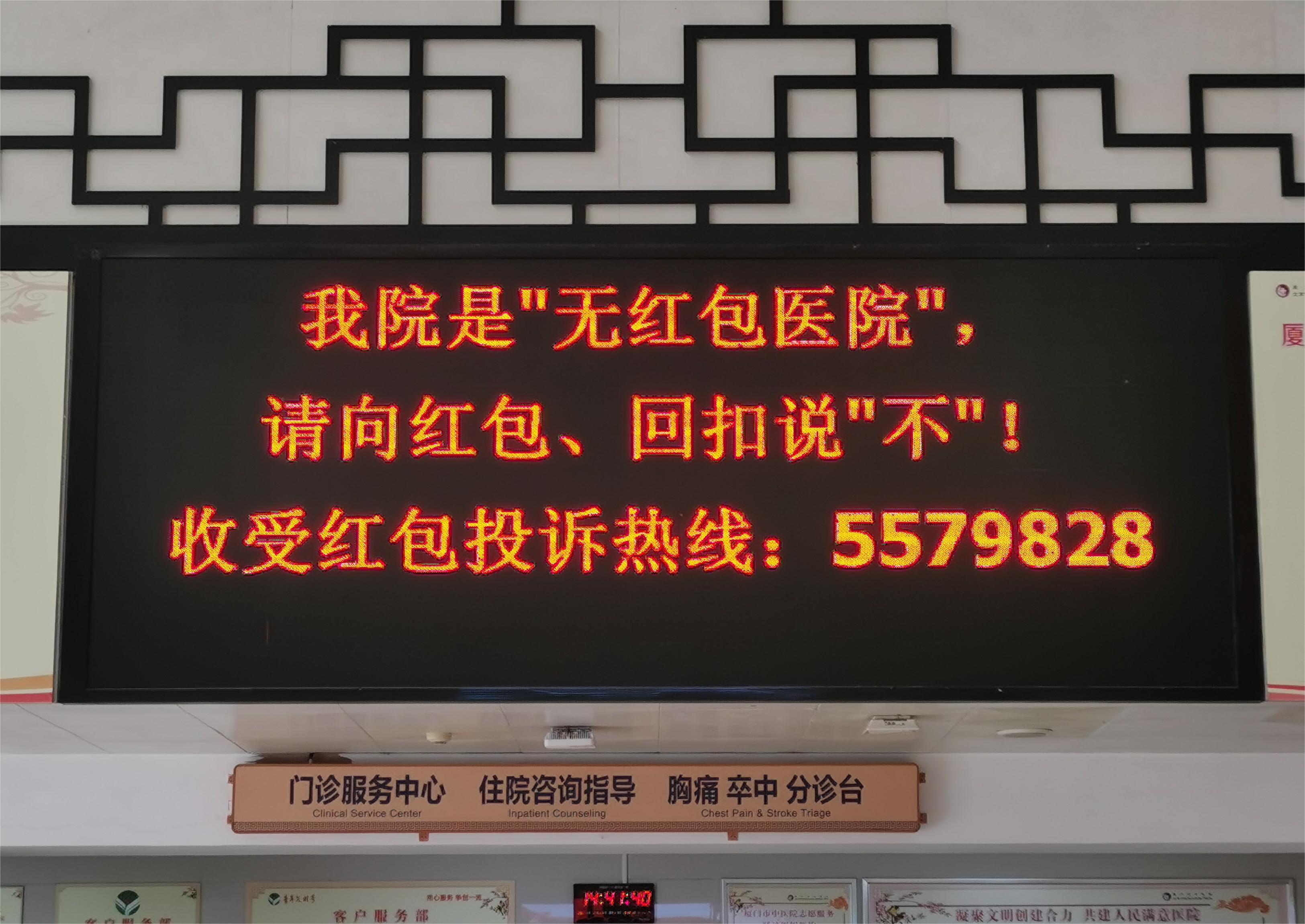 一是创建氛围。走进中医院,随处可见“无红包”医院标识;门诊多区域摆放《致患者及家属的一封信》,表明金瓶梅 拒收“红包”的坚决态度;医院门诊大厅的显示屏上滚动播放无“红包”医院的承诺以及严格遵守《医疗机构工作人员廉洁从业九项准则》的要求,时刻警醒着医务人员廉洁从医,也让广大的患者及家属深切感受到“无红包”医院的浓厚氛围。